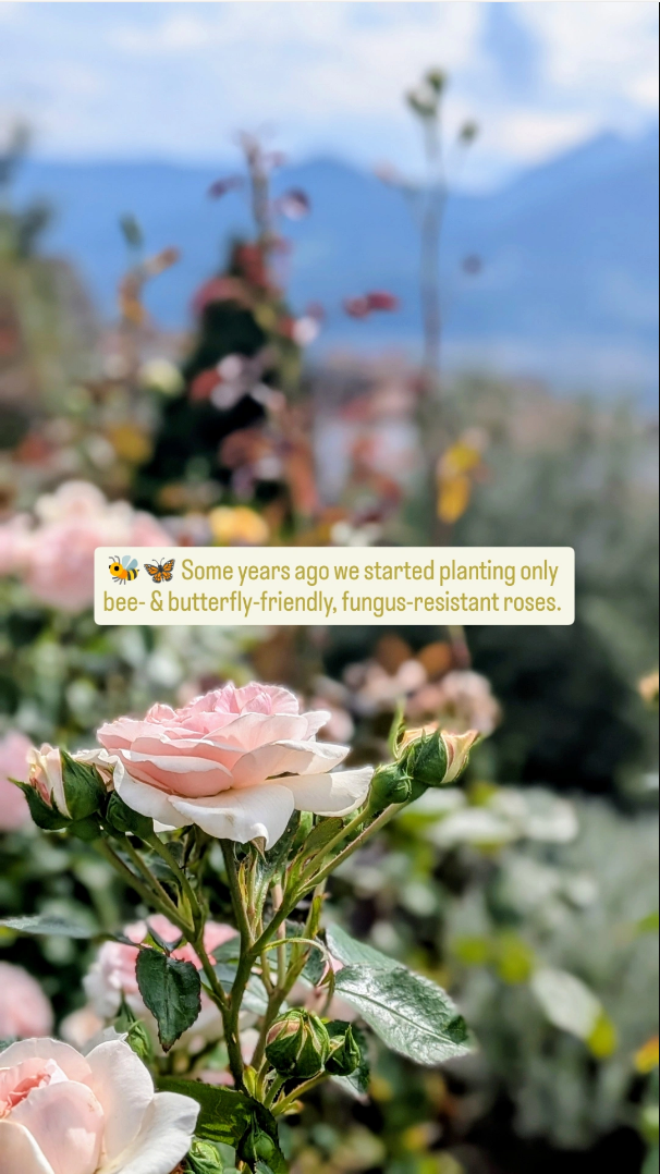 Der Garten ist über Jahrzehnte gewachsen. Seit 1957 gibt es das Hotel, schon die Elterngeneration legte Wert auf Vielfalt – auch wenn Begriffe wie Biodiversität damals noch nicht gebräuchlich waren. „Man hat vielleicht nicht von Nachhaltigkeit gesprochen, aber man wusste, dass alles zusammenhängt.“ Rosen spielten dabei immer schon eine besondere Rolle. „Schon meine Mutter hat Rosen gepflegt“, erzählt Christine. Heute werden sie nicht nur als Zierpflanzen kultiviert, sondern bewusst genutzt: für Dekoration, für Rosensäckchen, für Stempelmassagen und Fußbäder im Spa. Gepflanzt werden offene, autochthone und pilzresistente Sorten, um möglichst wenig Pflanzenschutz einsetzen zu müssen. „Offen blühende Rosen sind für Bestäuber wie Bienen und Hummeln besonders wertvoll, weil die Pollen leicht erreichbar sind“, weiß Christine.