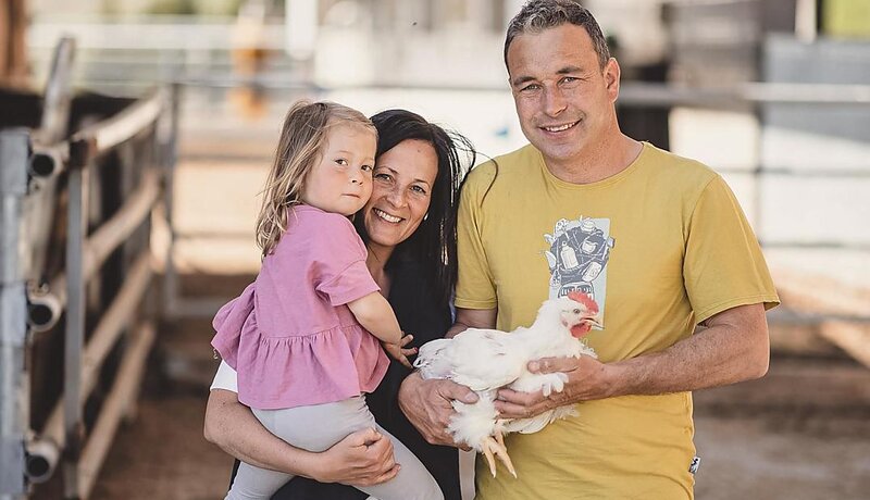 Im Jahr 2003 übernahm Josef Kerschbaumer von seinen Eltern den Öbersthof in Garn bei Feldthurns. Fünf Jahre später stellte er den konventionellen Milchviehbetrieb auf biologische Rinderhaltung mit Fleischproduktion um. 2018 schaute er sich gemeinsam mit seiner Frau Silvia nach einem zweiten Standbein um – und kam auf die Hühnermast. Nicht ohne Grund: Nur eines von 1000 Hühnern, das in Südtirol auf die Teller kommt, ist auch hier aufgewachsen. Der Bedarf an Hühnerfleisch sollte also gegeben sein – noch dazu, wenn es vom Biohof stammt. Tatsächlich beliefert Josef Kerschbaumer nun seit einigen Jahren insbesondere Gastbetriebe, aber auch Metzgereien mit Biohühnchen. Kunden und Gäste schätzen den außergewöhnlichen Geschmack des hochwertigen Fleisches. Nicht alle sind aber bereit, den für die aufwändige Mast notwendigen höheren Preis zu bezahlen.