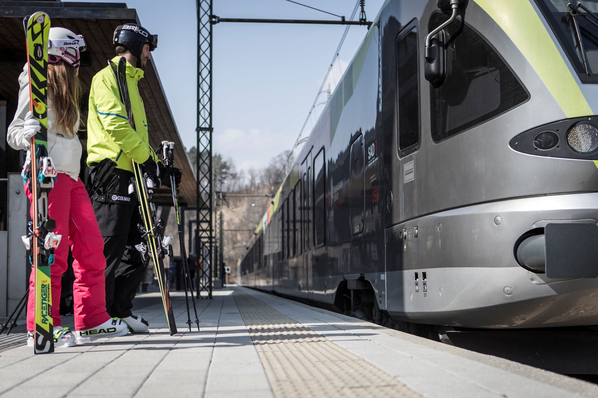 Wer mit Bus und Bahn ins Skigebiet fährt, setzt einen der wirksamsten Hebel für mehr Klimaschutz im Wintersport..